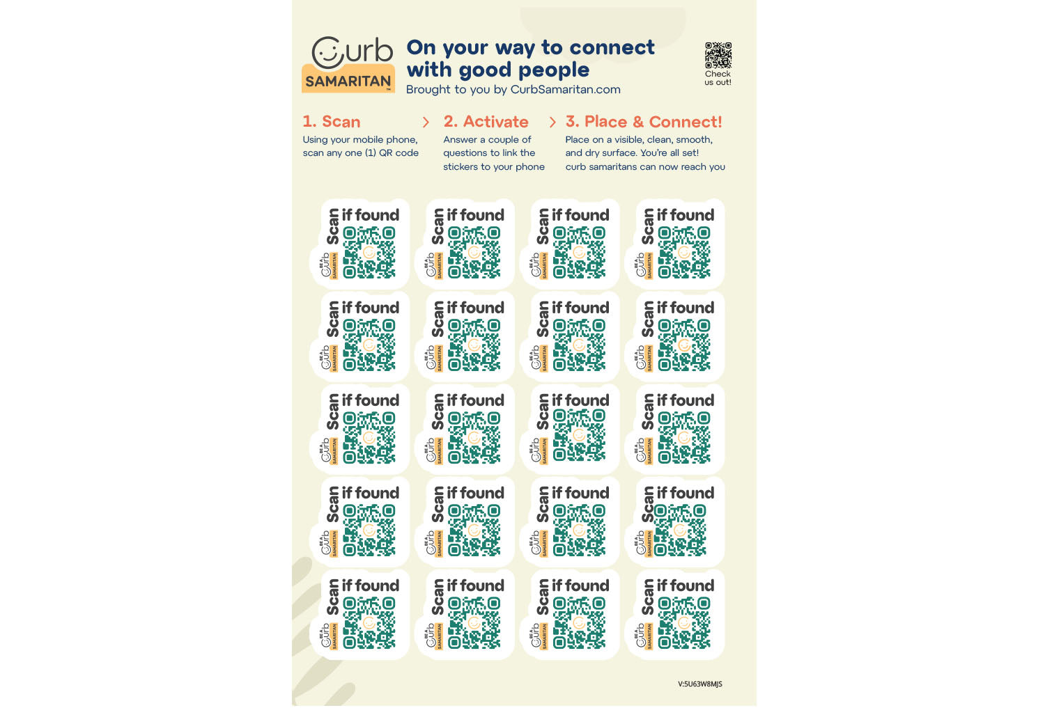 Sticker sheet includes: Qty 20 Found! connect stickers Each sheet uses the same QR code and ready for use once any one (1) sticker on each sheet is registered.